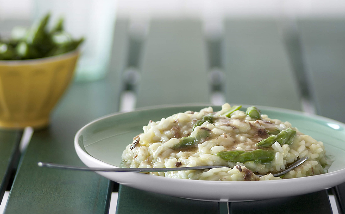 Continue the cooking slowly adding the water in which the asparagus have been boiled. Halfway through the cooking, add the mashed asparagus cream made initially, and shortly after add the asparagus tips.